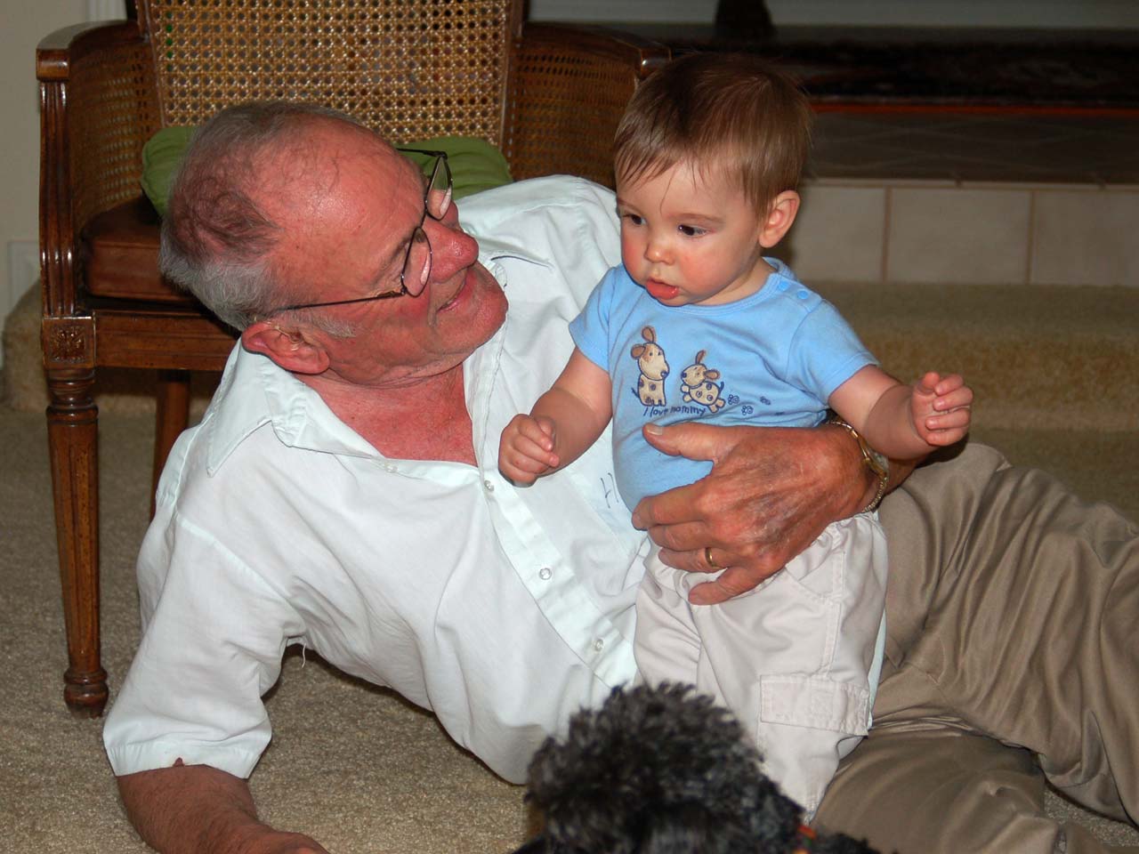 | Great Grandpa gives Ronin a dog toy | Playtime on the floor | ||